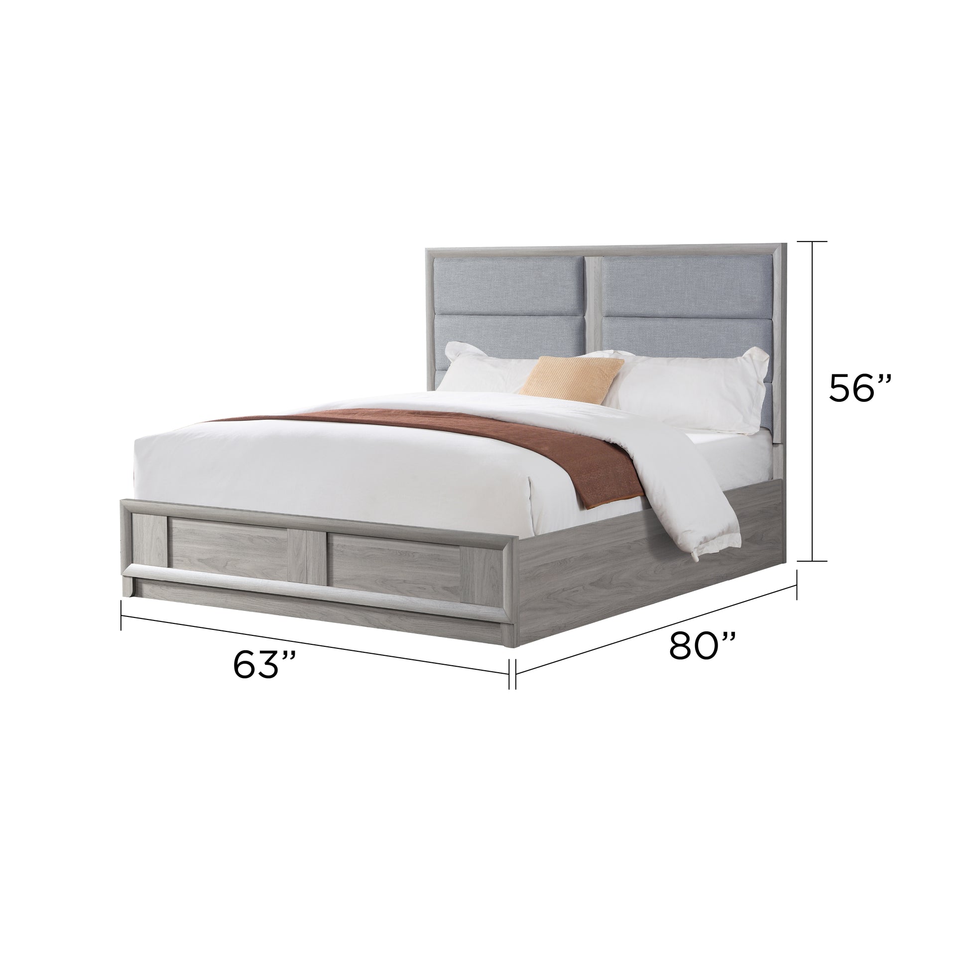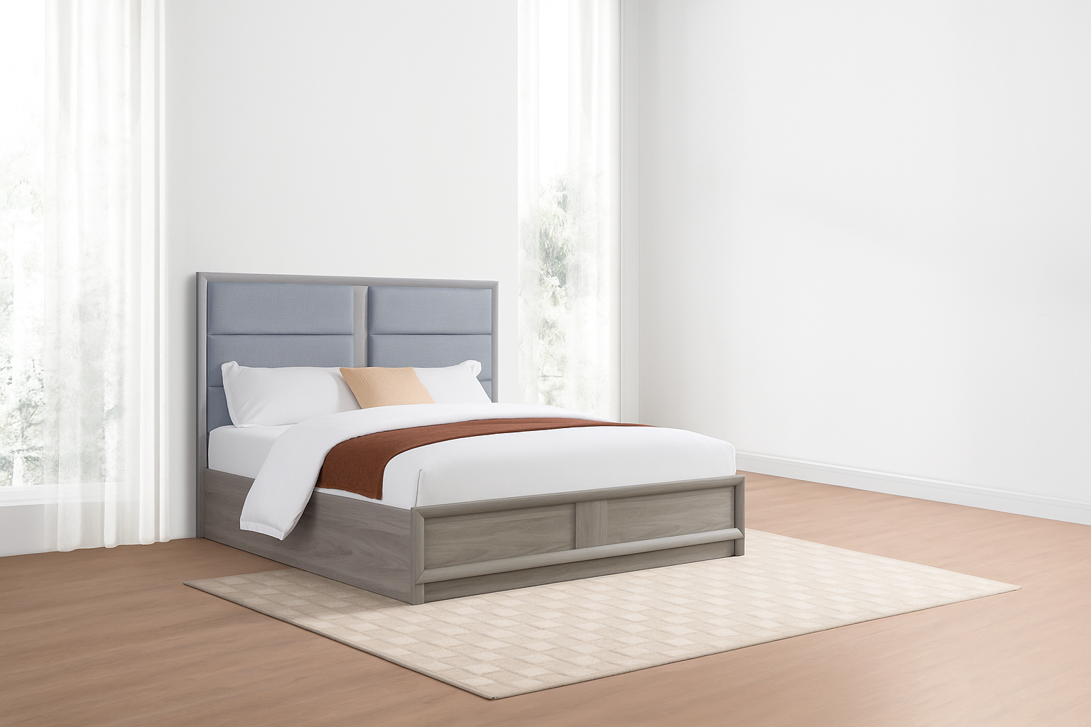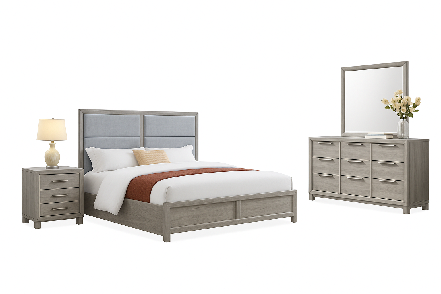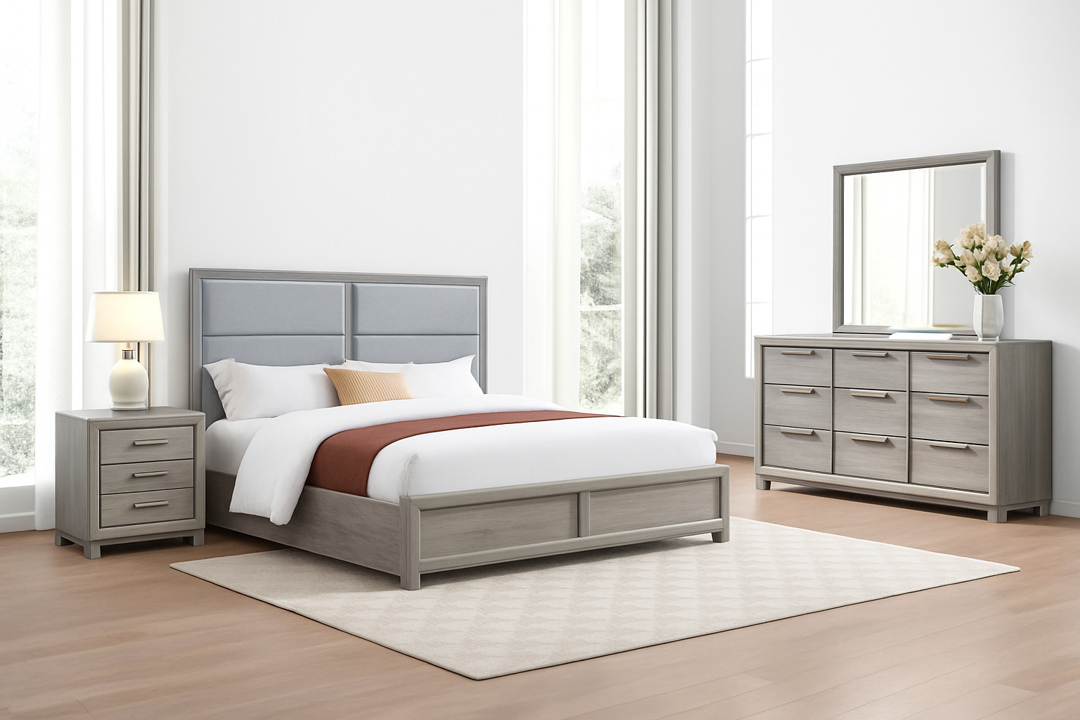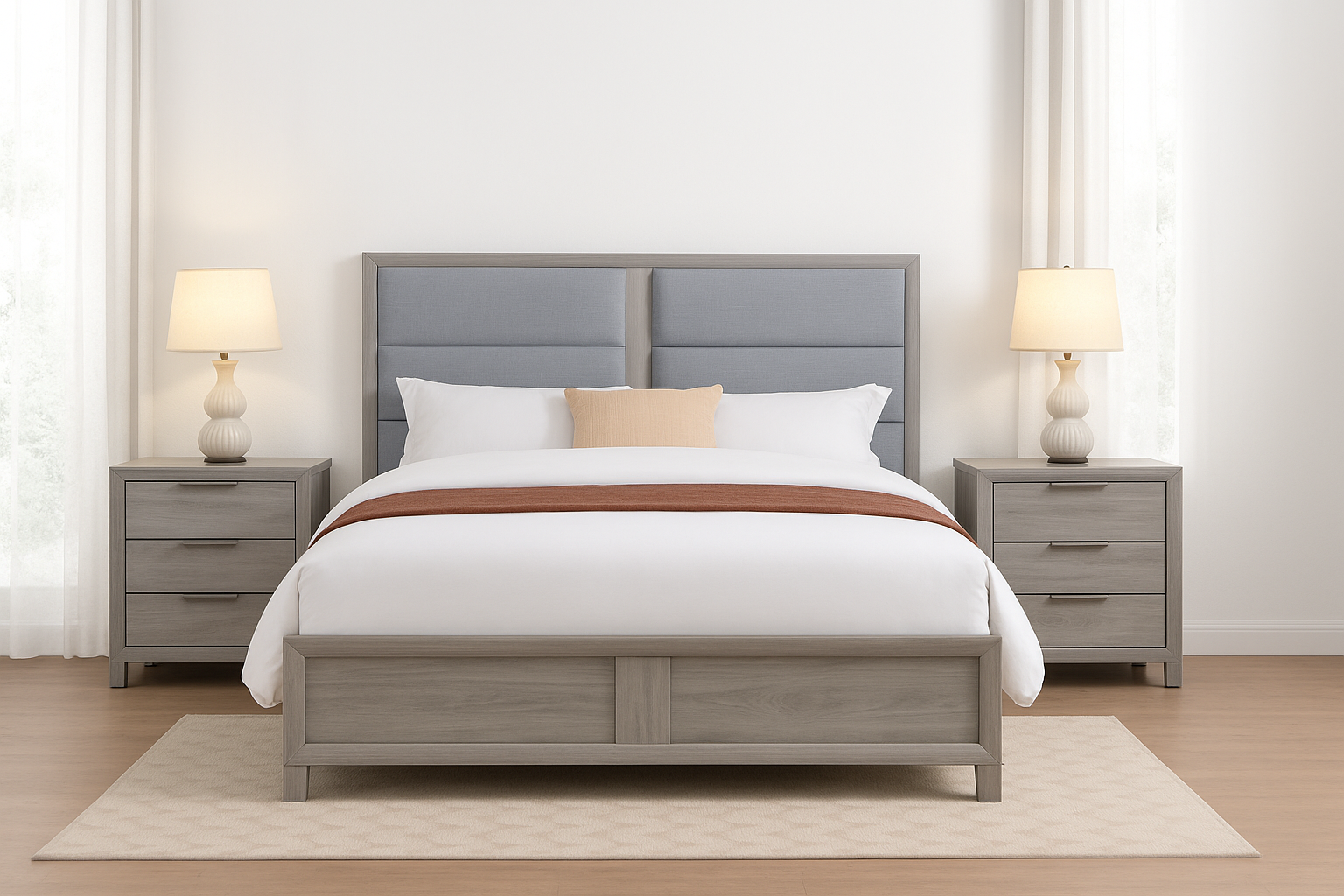 The centerpiece of this collection is the tall upholstered headboard, featuring a stylish panel design that adds depth and texture while offering plush back support. Crafted in a warm wood finish with clean, minimalist lines, the frame blends effortlessly into modern interiors, delivering a timeless and polished look.