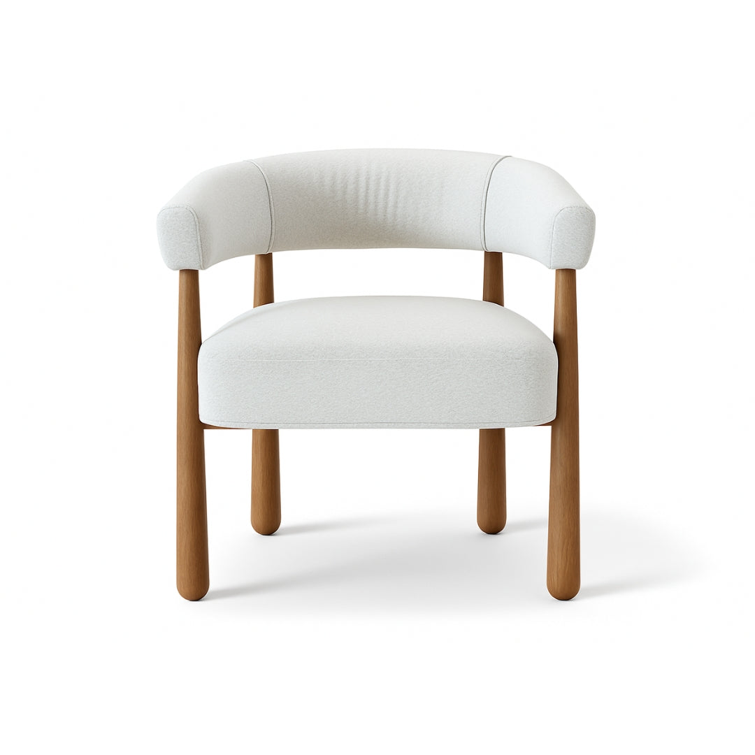 - The Chateau Accent Chair blends sculptural design with inviting comfort, making it a refined addition to lounges, lobbies, and living spaces. Upholstered in soft white fabric, the chair offers a clean, modern aesthetic enhanced by its rounded silhouette and generous cushioning. The open-back design and curved armrests create a balanced look that feels both airy and substantial. Crafted with a sturdy natural wood frame and rounded legs, the Chateau delivers durability while maintaining a warm, organic presence. Perfect as a statement piece or as part of a seating arrangement, this chair is suited for both residential and commercial settings.