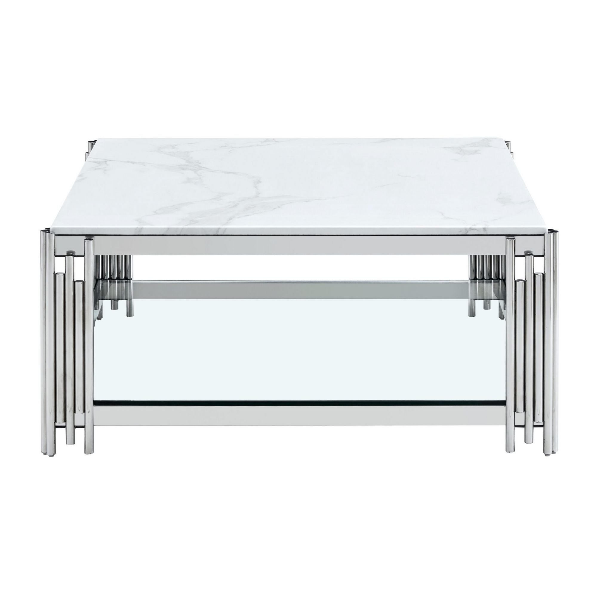 • Striking contrast between the solid white faux-marble top and the gleaming metal frame.