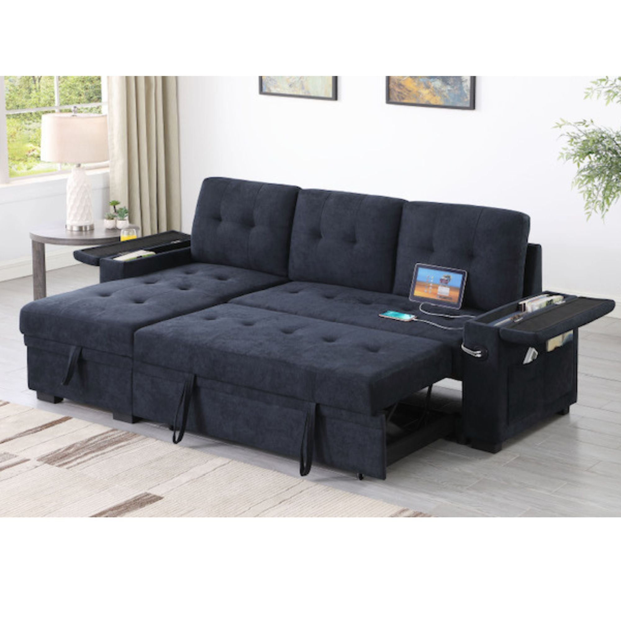 • Ample Storage – Hidden storage compartments beneath the chaise and pull-out section let you neatly tuck away blankets, pillows, and more.
