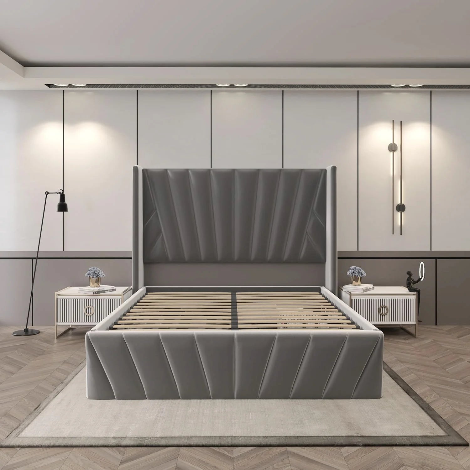 The Velets Eva Contemporary Mid-Century Soft Padded Tufted Upholstered Platform Bed brings style, comfort, and functionality to your bedroom. Crafted with a solid wood frame, it ensures durability and stability for a restful sleep. Its engineered wood slat system enhances mattress support and ventilation, extending mattress lifespan.