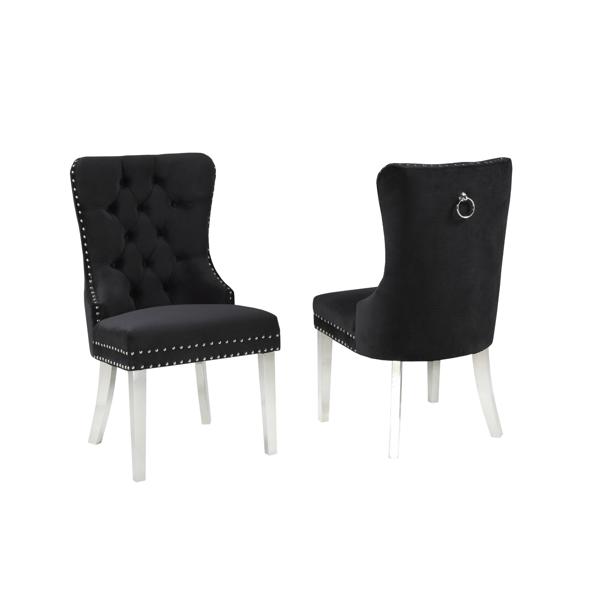 These set of 2 dining chairs a welcome addition to any chic dining space. The elegant but durable polyester fabric features a luxurious velvety finish for an inviting look and feel. Traditional tufted accents on the comfortably cushioned seat back are a handsome complement to the sophisticated and sturdy nail-head trim. A convenient chrome-plated pull handle on the back adds modern appeal and makes it easy to re-position this dining chair as needed. With its fashionable colour and chrome finished legs, this versatile chair fits seamlessly into any contemporary or traditional décor scheme. Group multiple dining chairs around a table or bar to create an elegant dining set or place them individually around your home as accent pieces or for extra seating when entertaining.