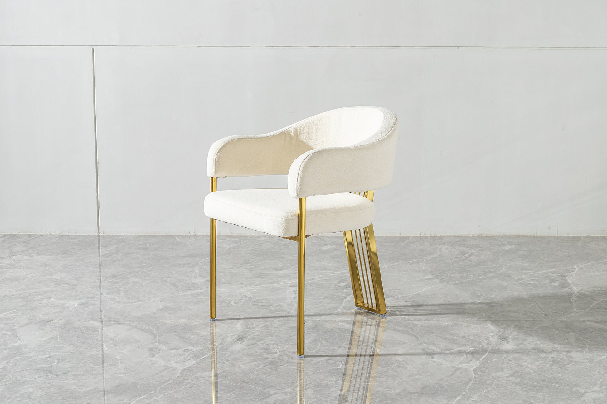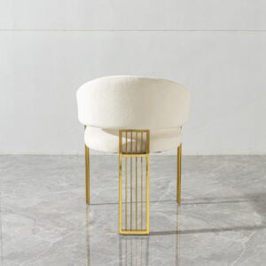 The sculptural gold pedestal base offers both stability and artistic flair with its elegant open-weave design, while the soft upholstered chairs provide comfort and contemporary style. Each chair features plush cushioning, curved armrests, and bold gold metal accents, making every meal feel like a fine dining experience.