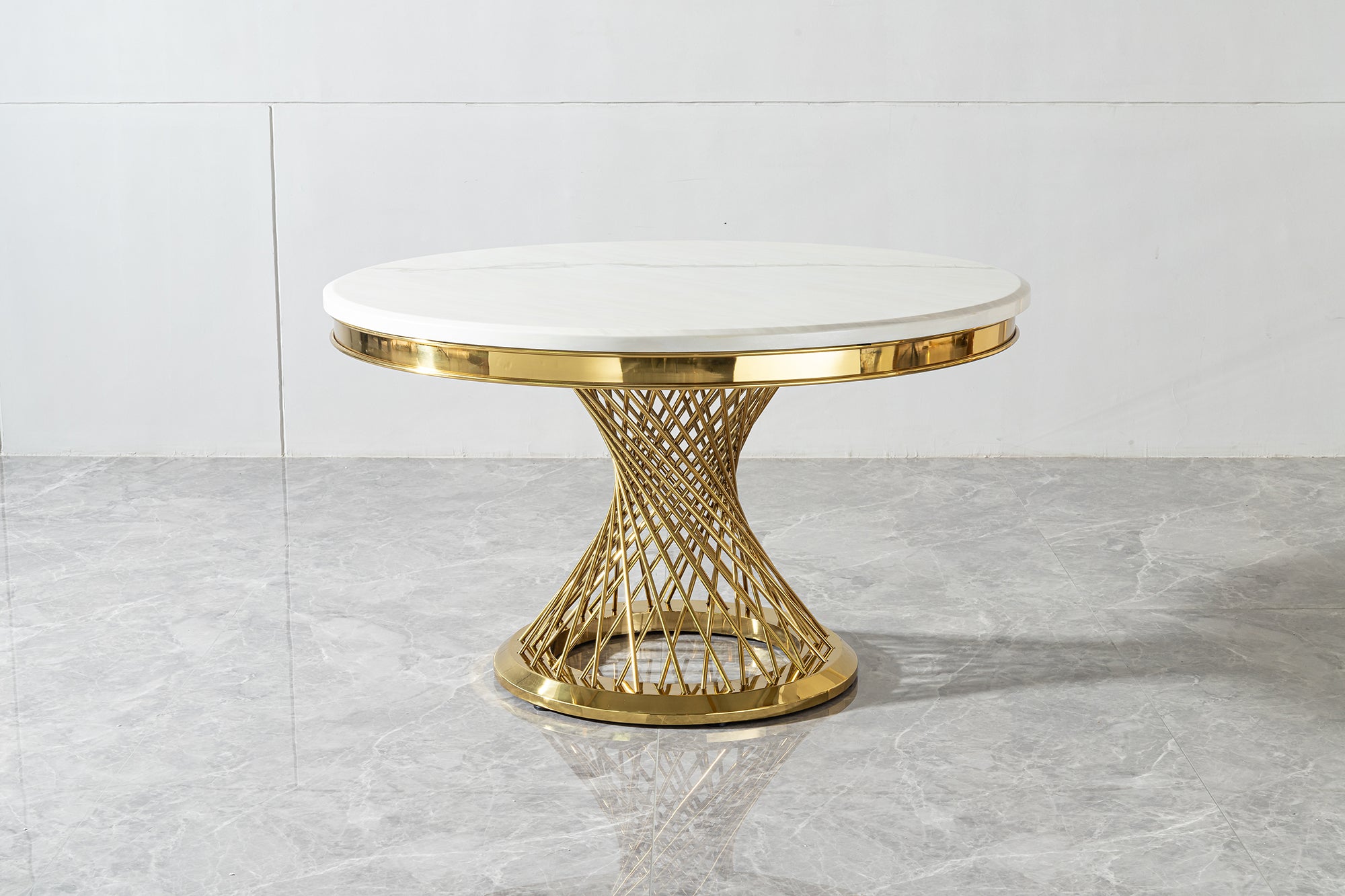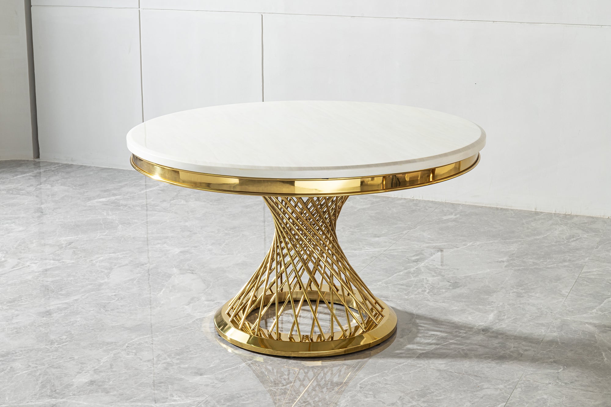 Add a touch of glamour and sophistication to your home with the Kim Gold Dining Table Set. This stunning modern round dining set features a sleek white faux marble tabletop paired with a striking gold stainless-steel base, creating a luxurious centerpiece that elevates any dining space.