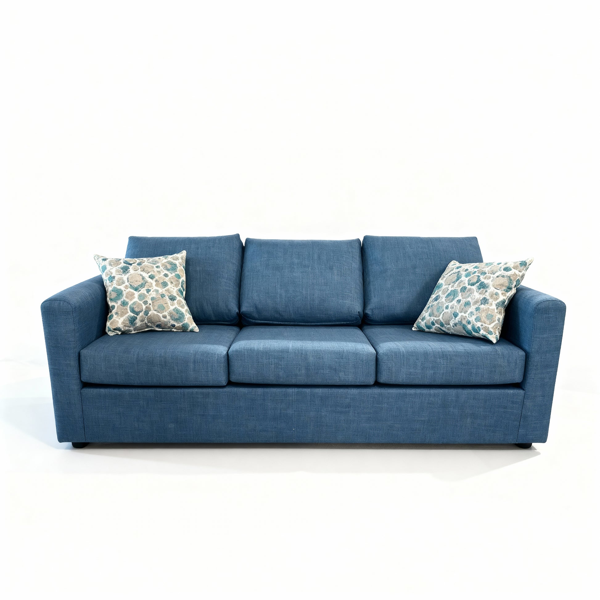 Upgrade your living space with the elegant Blue Haven Sofa, proudly made in Canada and designed for both comfort and durability. Upholstered in rich blue fabric, this modern three-seater sofa brings a clean, contemporary look that complements a wide range of home décor styles. Its plush seat cushions and supportive back provide exceptional comfort for everyday lounging, entertaining guests, or relaxing with family.