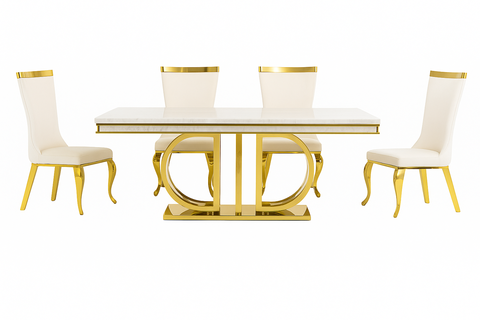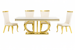 The set includes four high-back dining chairs upholstered in premium white fabric, featuring refined gold accents that beautifully match the table’s base. Designed for both comfort and style, these chairs offer plush seating and a graceful silhouette ideal for family gatherings or elegant dinner parties.
