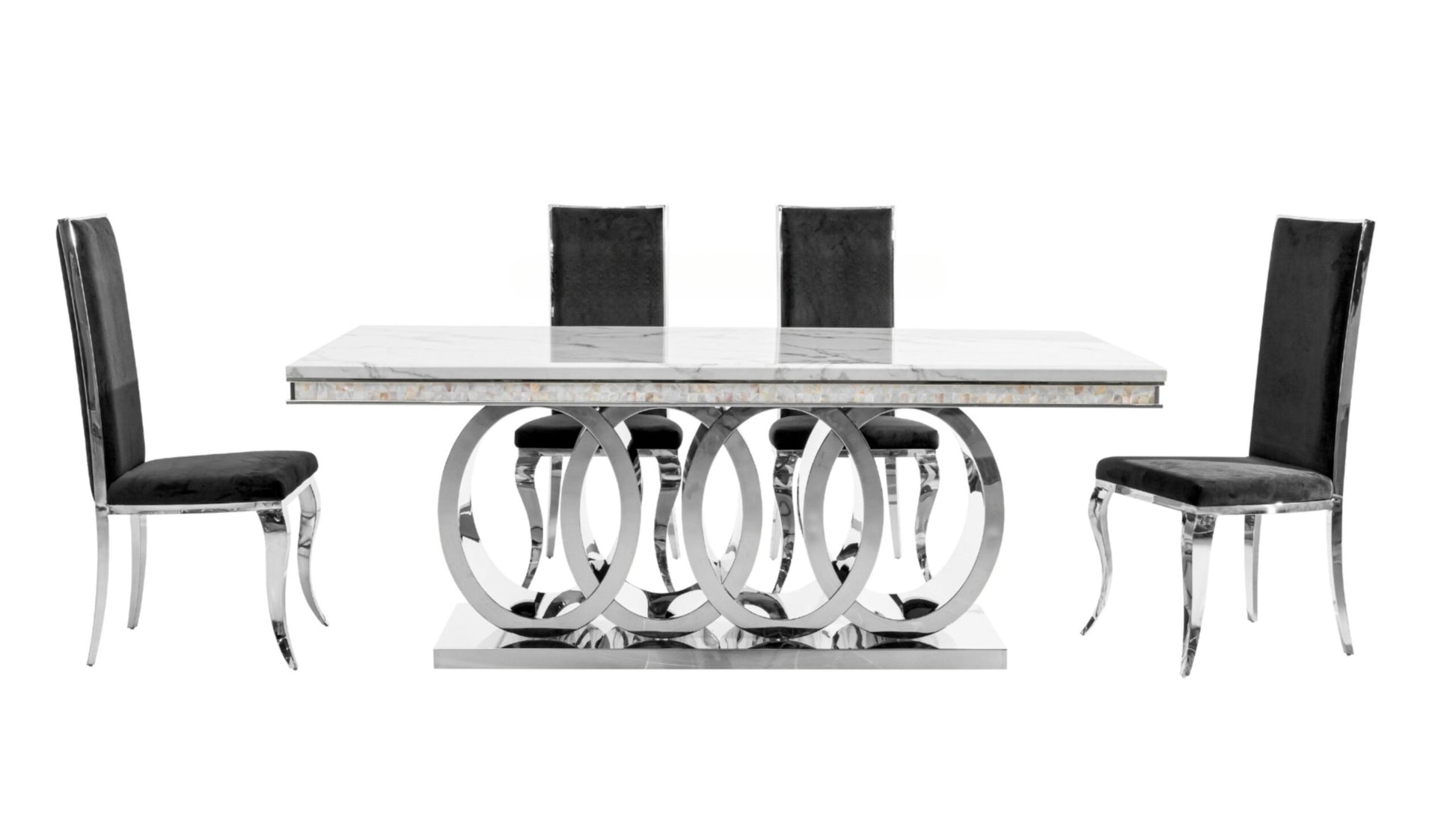 The Ottawa set includes high-back dining chairs accented with polished silver frames, offering a bright, sophisticated look that perfectly complements the marble top. Designed with high-quality materials, this dining set ensures durability, comfort, and timeless style — ideal for both everyday dining and upscale entertaining.