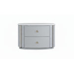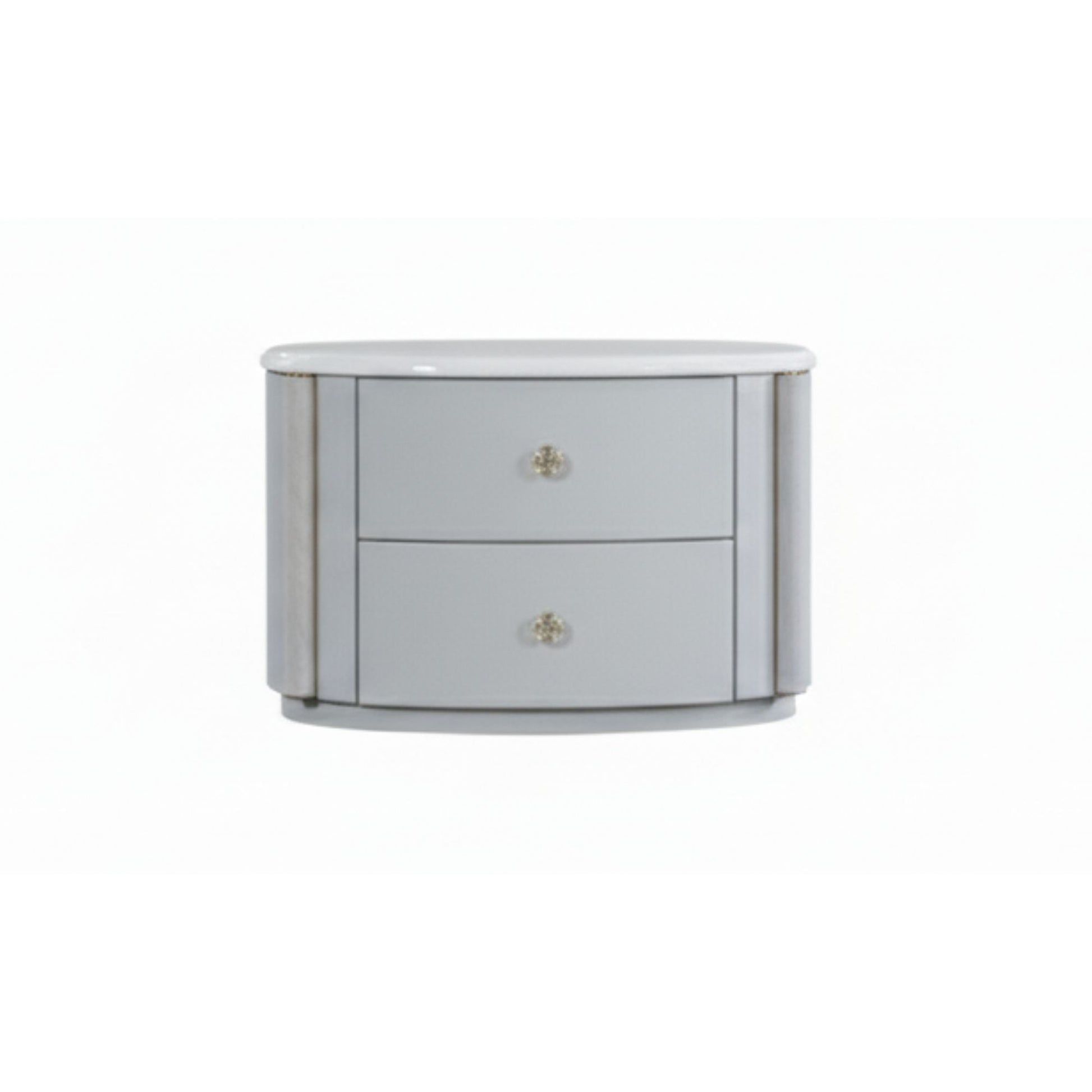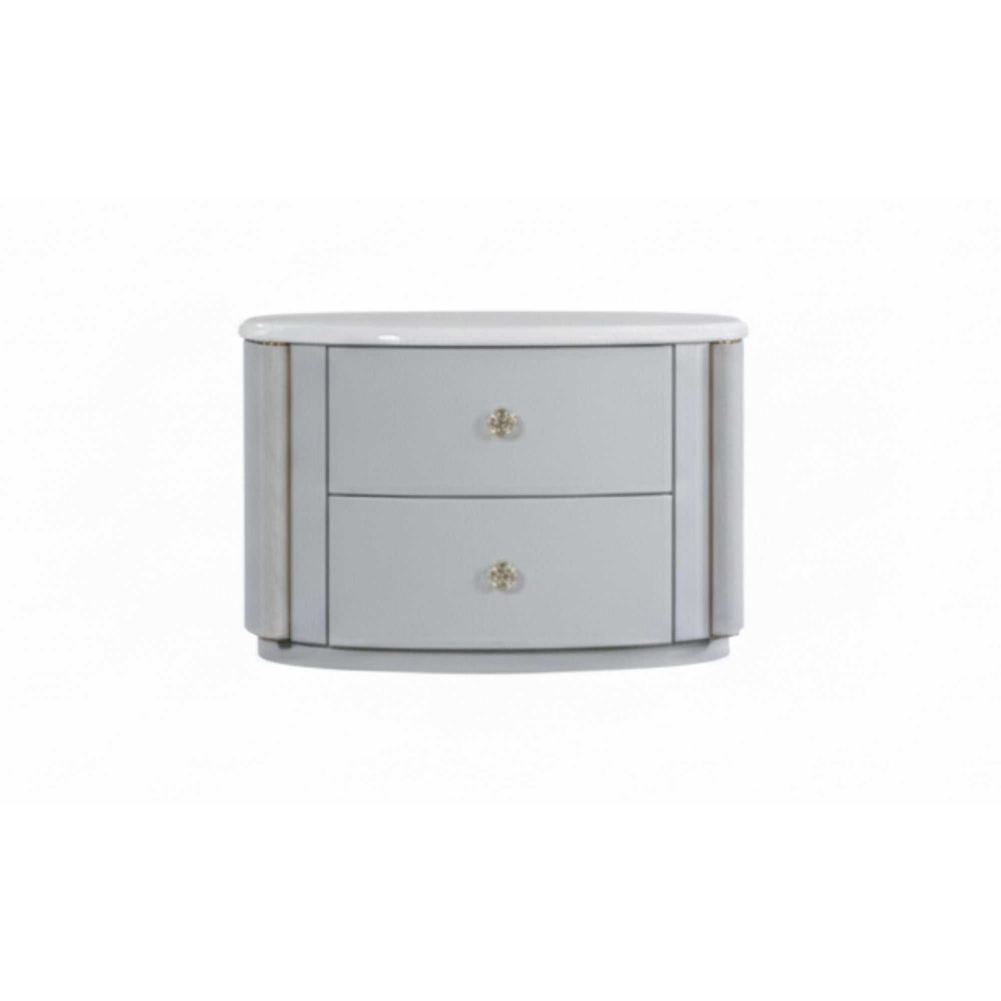 Rounded edges, two soft-close drawers, glossy white finish, and gold handles.
