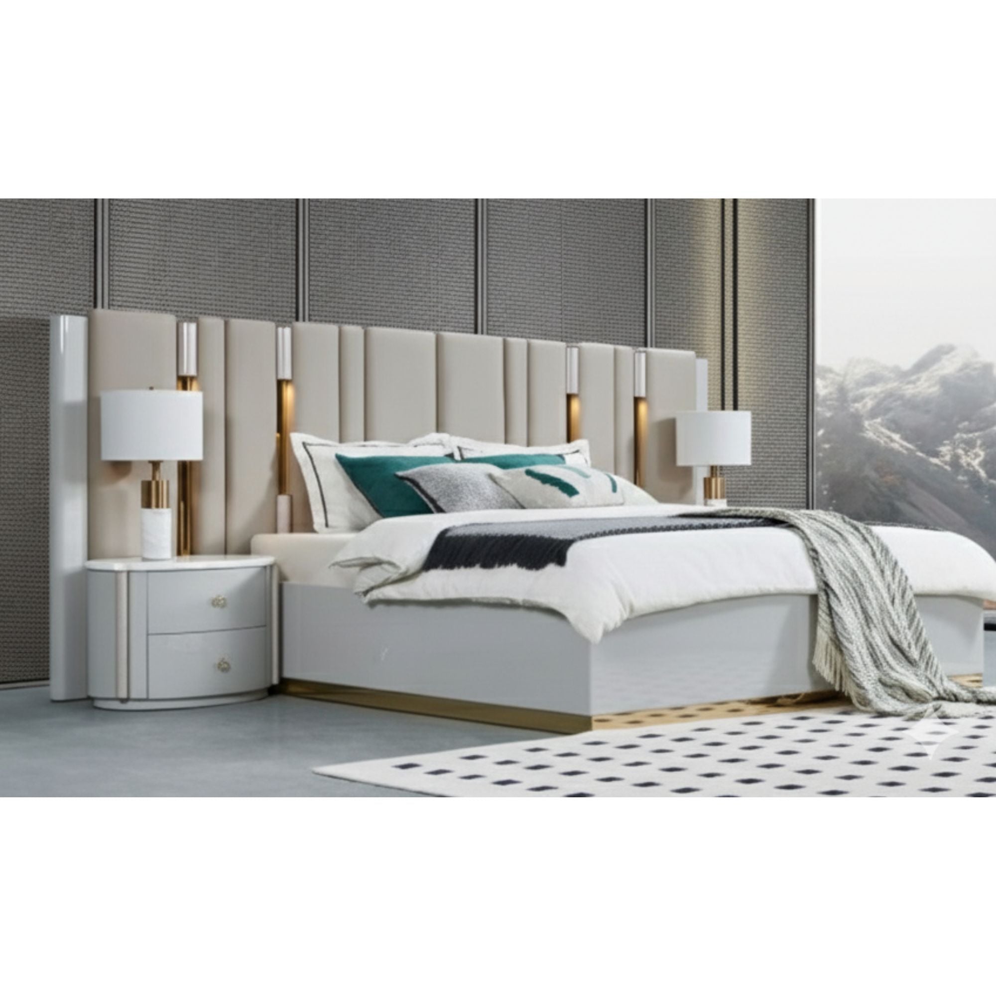 Bed: Upholstered in light beige with channel tufting and gold trim. LED-lit headboard and platform base for a sleek, contemporary look.