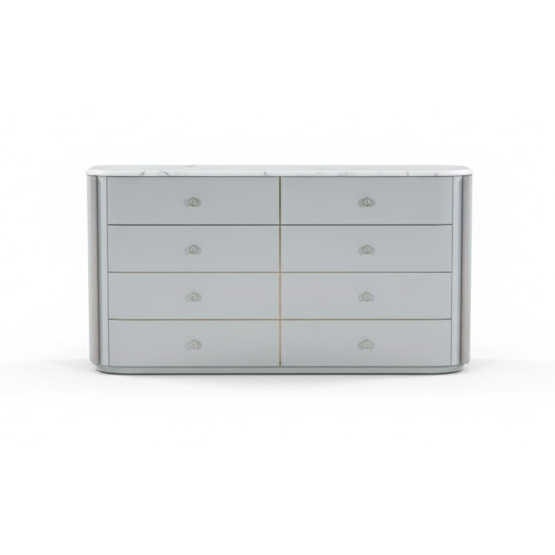 Chest: Five-drawer tall design with curved edges and gold detailing for vertical storage.
