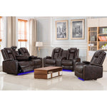 The Transformer 3-Piece Modern Power Recliner Set offers a luxurious and comfortable seating experience with its advanced features. Equipped with dual motors for powered recline and adjustable headrests, this set allows you to find the perfect position for relaxation. Enjoy added convenience with drop-down cupholders, USB and plug-in ports, and bright LED lights across the bottom for a stylish touch. The recliners feature heavy chain stitching, unique patterning on the backrests, and an air leather finish, combining durability with elegance. Available in black or chocolate brown, this sectional transforms your living room or home theater into the ultimate comfort oasis.