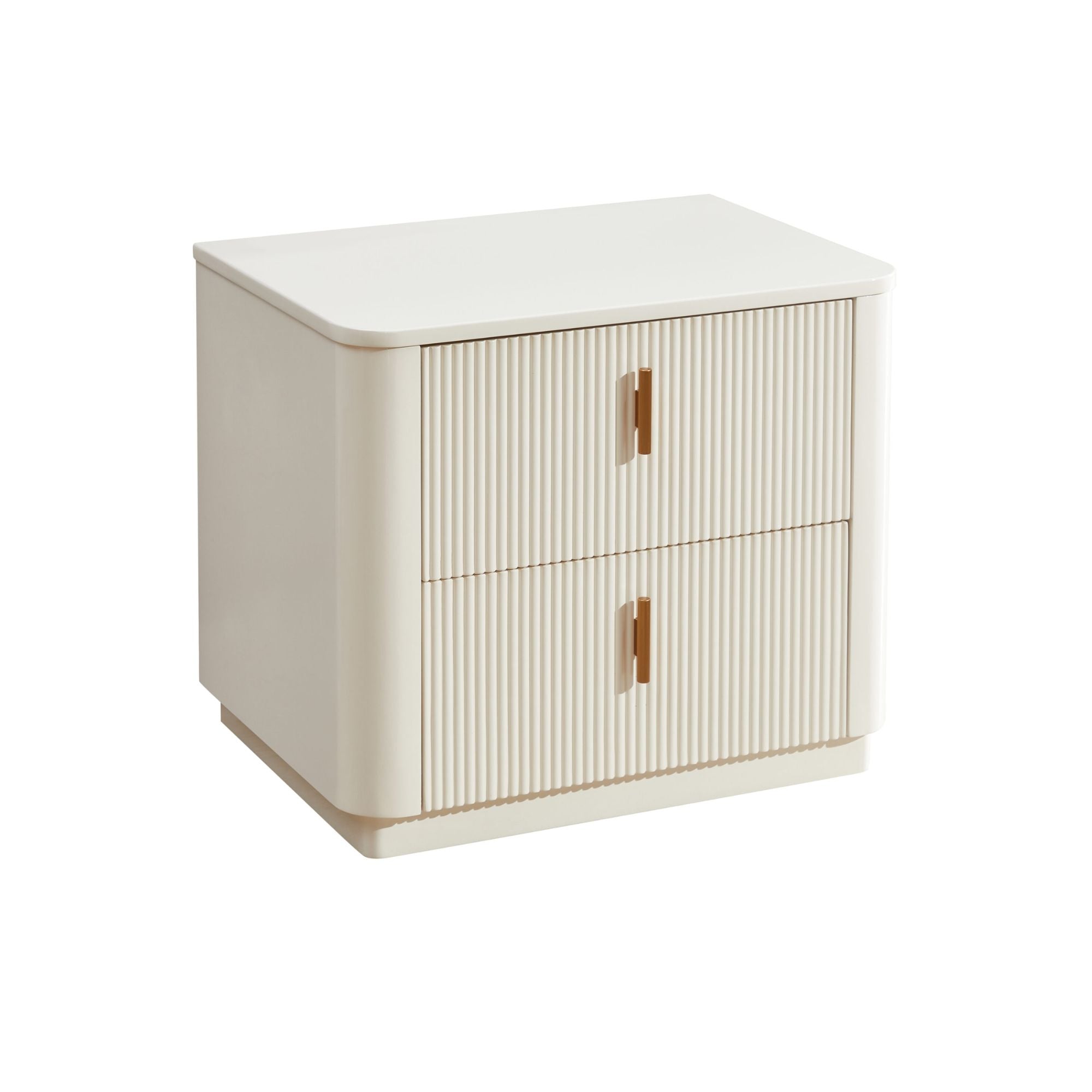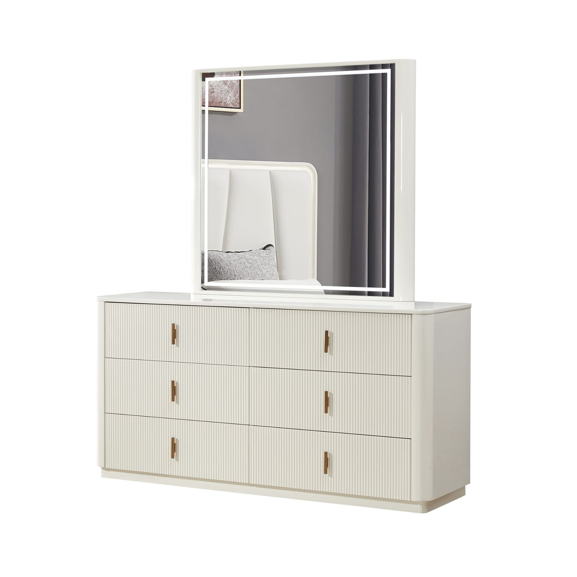 - Storage (Case Goods): Dresser and Chest with distinctive textured/grooved drawer fronts and minimalist gold-tone hardware, adding a touch of elegance.