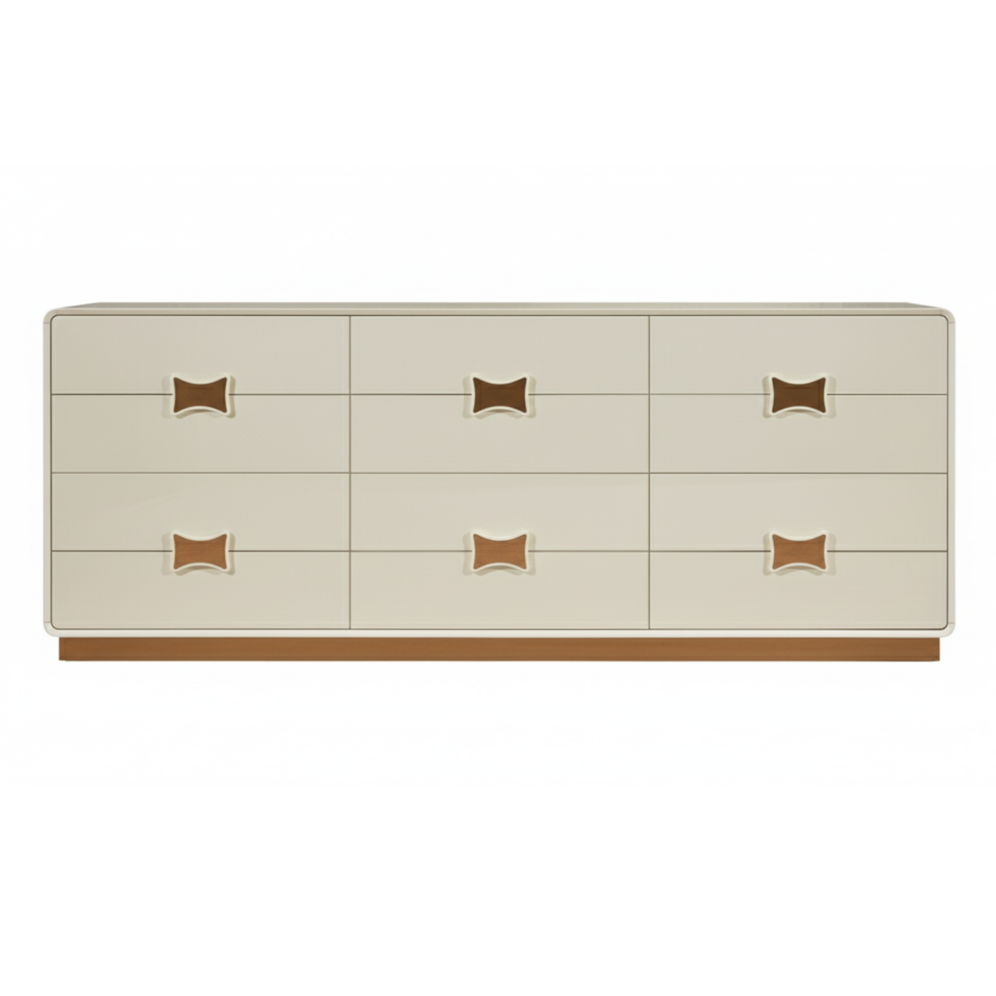 Case Goods: Matching dresser and chest of drawers in a smooth, light cream finish. They are distinguished by unique dark, bow-shaped drawer pulls.