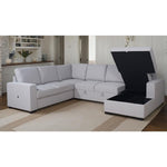 The Xander Sectional combines smart functionality with cozy comfort, making it an essential addition to your living space. Upholstered in soft grey fabric with a tufted seat design, this versatile sectional easily converts into a bed, providing extra sleeping space when needed. A built-in USB port ensures convenient device charging, while the chaise offers hidden storage to keep your living area organized. Whether you're lounging, entertaining, or hosting overnight guests, the Xander Sectional delivers both style and practicality in one sleek package.