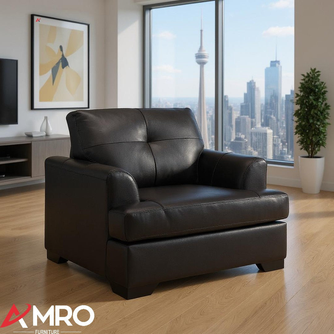 The Sofa by Fancy Zurick Leather Chair is the modern and sleek enhancement you've been seeking. Its contemporary design and elegant neutral hue make it the ideal collection to invigorate your living room. Embrace the luxury and enduring worth of a match crafted from premium grain leather, which is both comfortable and long-lasting; proudly manufactured in Canada.