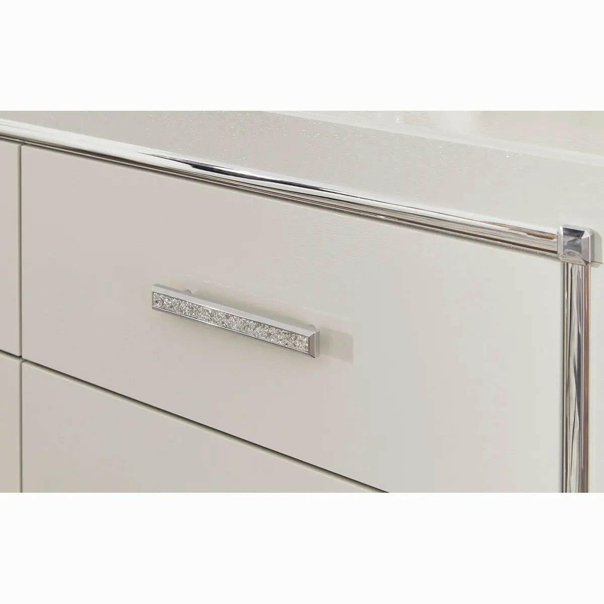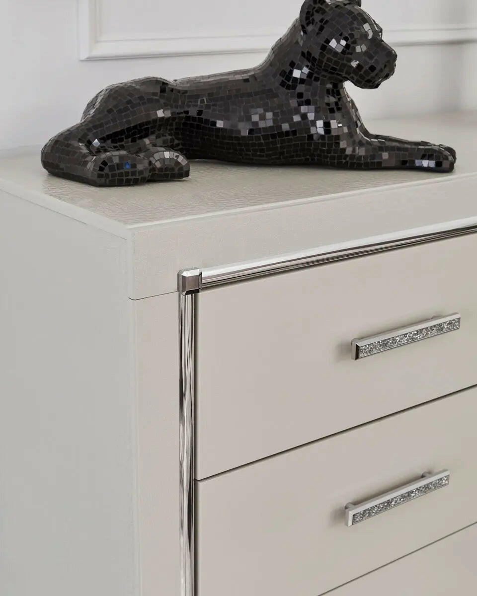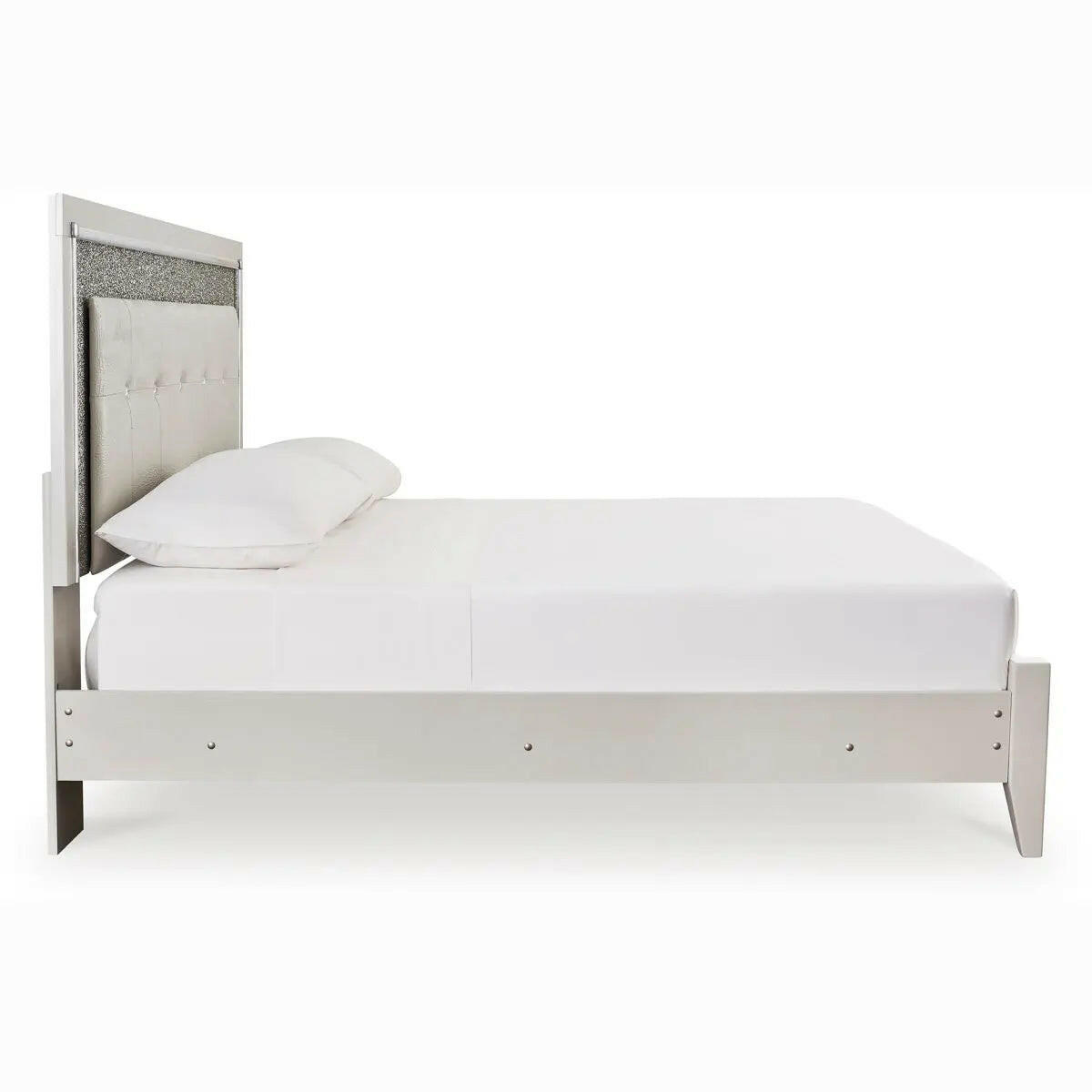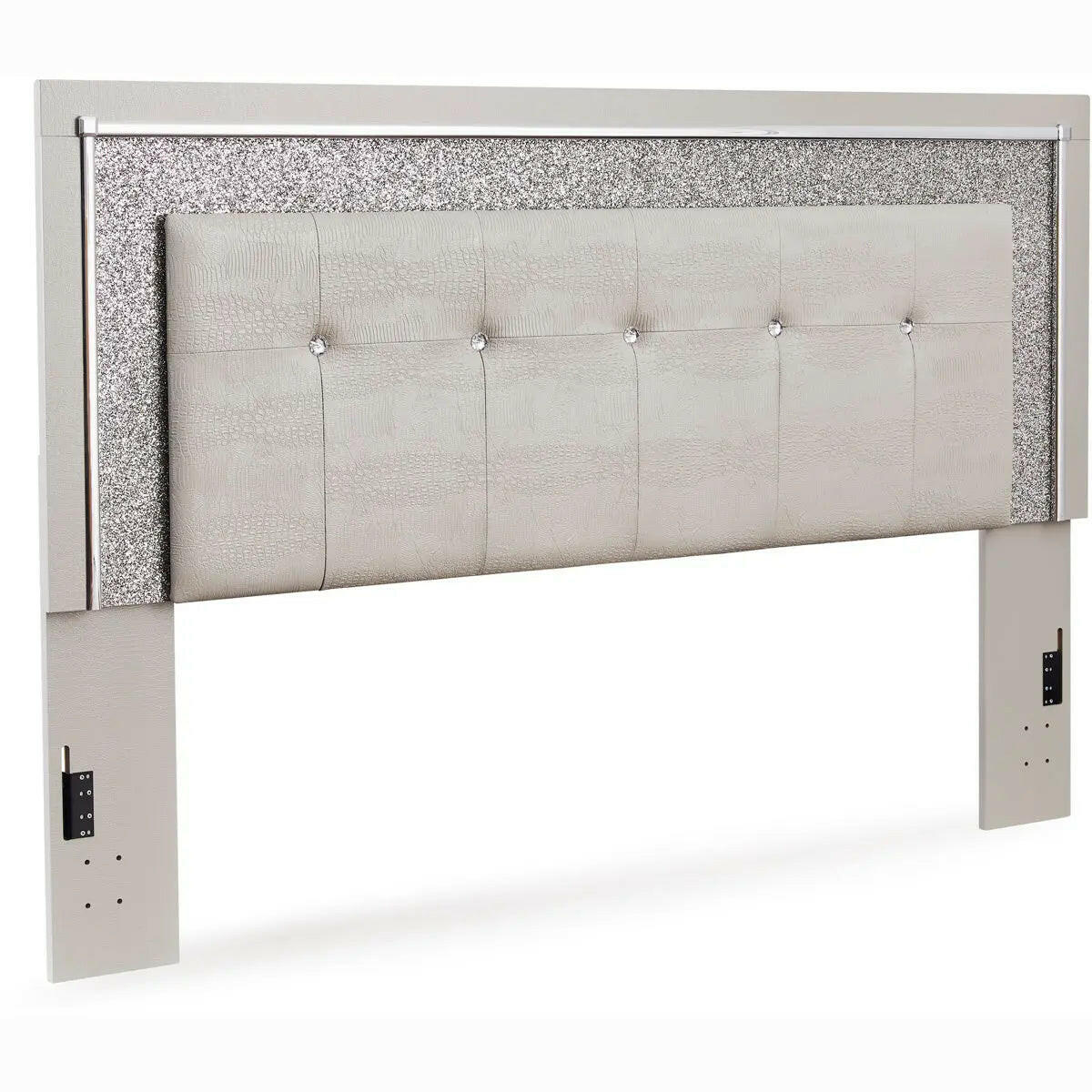- Headboard with faceted chrome-tone details, faux crystal tufted silver upholstery with faux alligator effect and glitter inlays