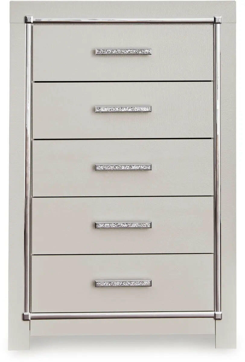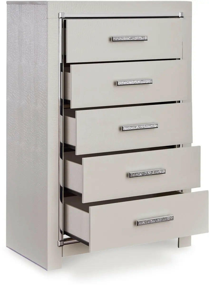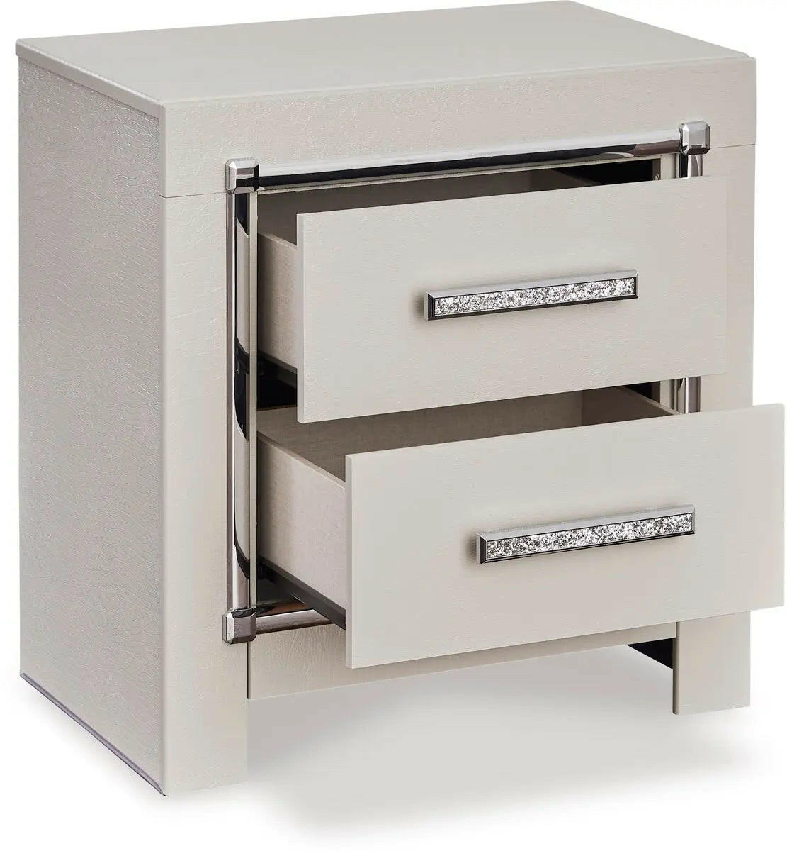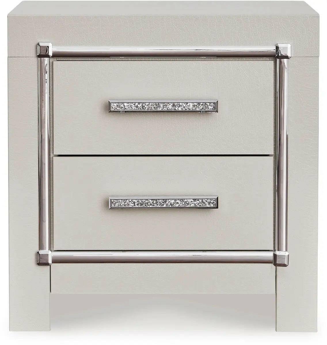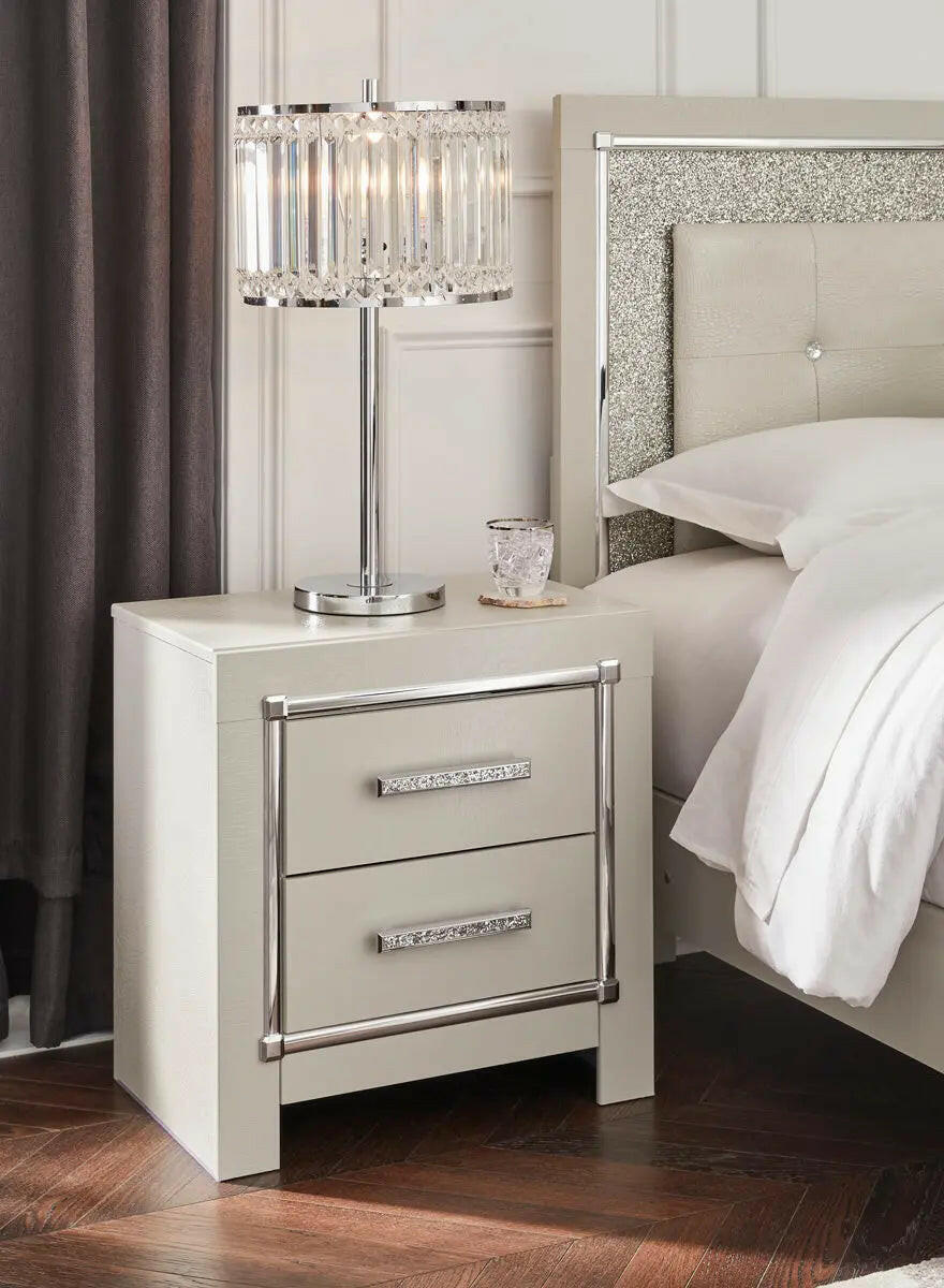 Bright, bold luxury. This upholstered bedset dazzles with its attention to detail. Your love of glamorous style is reflected in the tufted upholstery with faux alligator effect, exquisitely paired with faceted chrome-tone and glittery details. Complete with LED lighting around the headboard, it inspires you to live luxuriously every day—from waking up to reading before bed.